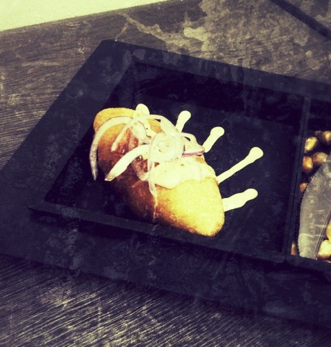Y para terminar, nos dio a probar una papa rellena de lomo de buey. Menuda pasada de plato, cuando muerdes el magnífico crujiente que recubre la patata, te encuentras con un guiso peruano de cebolla, pasas, lomo de buey, huevo, ají panca y salsa de rocoto (fruta muy picante), que le da el toque de alegría (picante) que me gusta en los platos.