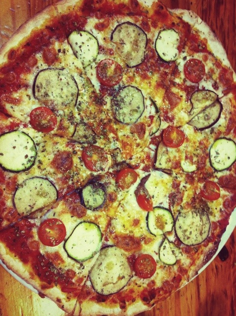 Y una Barkanino (berenjenas, calabacín, queso, parmesano y tomate), que estaba crujiente, con unos buenos trozos de  verdura fresca, con una salsa de tomate casera que no he probado en ningún lado igual y un toque de orégano y parmesano que hace que sea una pizza sana, rica y para vegetarianos.