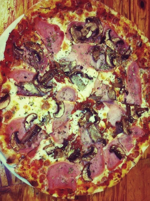 Y de segundo 2 pizzas grandes para los 4 que íbamos: una Toscana (jamón york, champiñón, queso y tomate) para los carnívoros, en la que el sabor del jamón y los champis está resaltado por la salsa casera de tomate, QUÉ MARAVILLA!!!