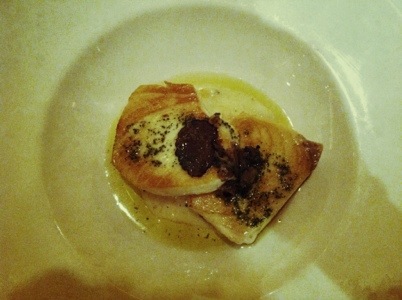La lasaña de alcachofas fue el entrante que más gusto en la mesa, incluso a los que no les gustan las verduras. Es una falsa lasaña, donde lo que normalmente seria la placa de pasta, se usan hojas de alcachofas, a las que se le añaden setas, una fina bechamel y se gratina al horno con queso y tomate concassé en daditos por encima, un lujo haberlo pedido y un delito para aquel que no se atreva a probarlo.