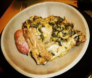 Las cazuelas son otro plato típico que recomiendo pedir un día de frío porque es abundante y muy saciante. La nuestra llevaba salchichas, costillas, patatas y una verdura parecida a los grelos. Estaba riquísima pero en verano no es el plato óptimo, claramente ;).