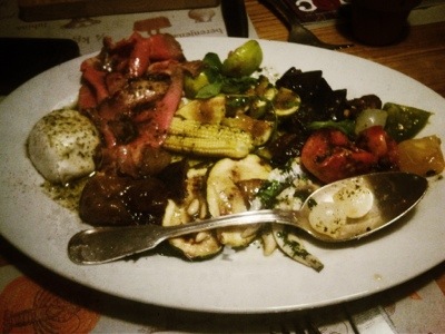 Para picar tienen un aperitivo mediterráneo a base de verduras asadas, quesos, boquerones en vinagre, roast beef y diferentes platos que llaman MEZZE. Nosotras pedimos el mediano que son 16€, pero también ofrecen un tamaño más grande, que nos podríamos haber comido perfectamente porque estaba tan rico…los tomates muy sabrosos, el roast beef estaba loncheado como se merece, la mozzarella era cremosa y venía bañada en pesto fresco con piñones salteados, los panes eran crujientes y de diferentes harinas…una auténtica fiesta gastronómica.