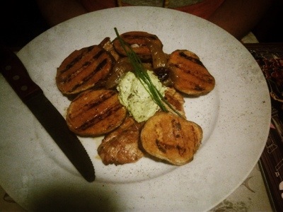 El plato que más gustó en la mesa fue la PRESA IBÉRICA CON MANTEQUILLA DE MOSTAZA Y BONIATO CRUJIENTE. El sabor de la carne era suave gracias al dulzor del boniato (tubérculo de la familia de las patatas muy poco usado en la cocina española), el plato tenía un color que te apetecía mirar y no comértelo y la mantequilla era ligera, verde y cremosa.