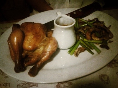El plato que recomiendo para los que vayan con mucha hambre es el COQUELET CON SALSA TETSU Y NIRAS CON CHAMPIS. El coquelet es un «pollito enano» llamado picantón, que lo sirven con champiñones, una especie de judías verdes y lo riegan con una salsa hecha a base de Tetsu (de origen japonés). Fue, para mi gusto, el plato más flojo de los que pedimos, pero es que la competencia era muy alta. Lo mejor la salsa :).