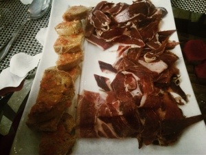 La comida fue en el restaurante Es Castell, donde nos atendieron ejemplarmente, como la ocasión merecía. Empezamos brindando por los novios con unas buenas copas de champagne y un buen plato de jamón ibérico con el famoso pa amb oli mallorquín.
