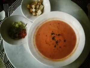 De primeros unos tomamos Gazpacho con su guarnición, que era una sopa fría, ligera, suave y muy refrescante, el plato idóneo para un día de tanto calor.