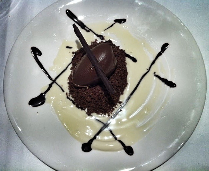 Y los super golosos pidieron el chocolate en texturas: bola de mousse de chocolate, con crocante de chocolate negro y bañado en chocolate blanco. ¡¡Una bomba!!. Sobretodo después de la buena comida que nos habíamos metido para el cuerpo. Pero cada chocolate potenciaba el sabor del otro, y habían conseguido crear un plato de chocolates vistoso, poco empalagoso y muy apetecible.