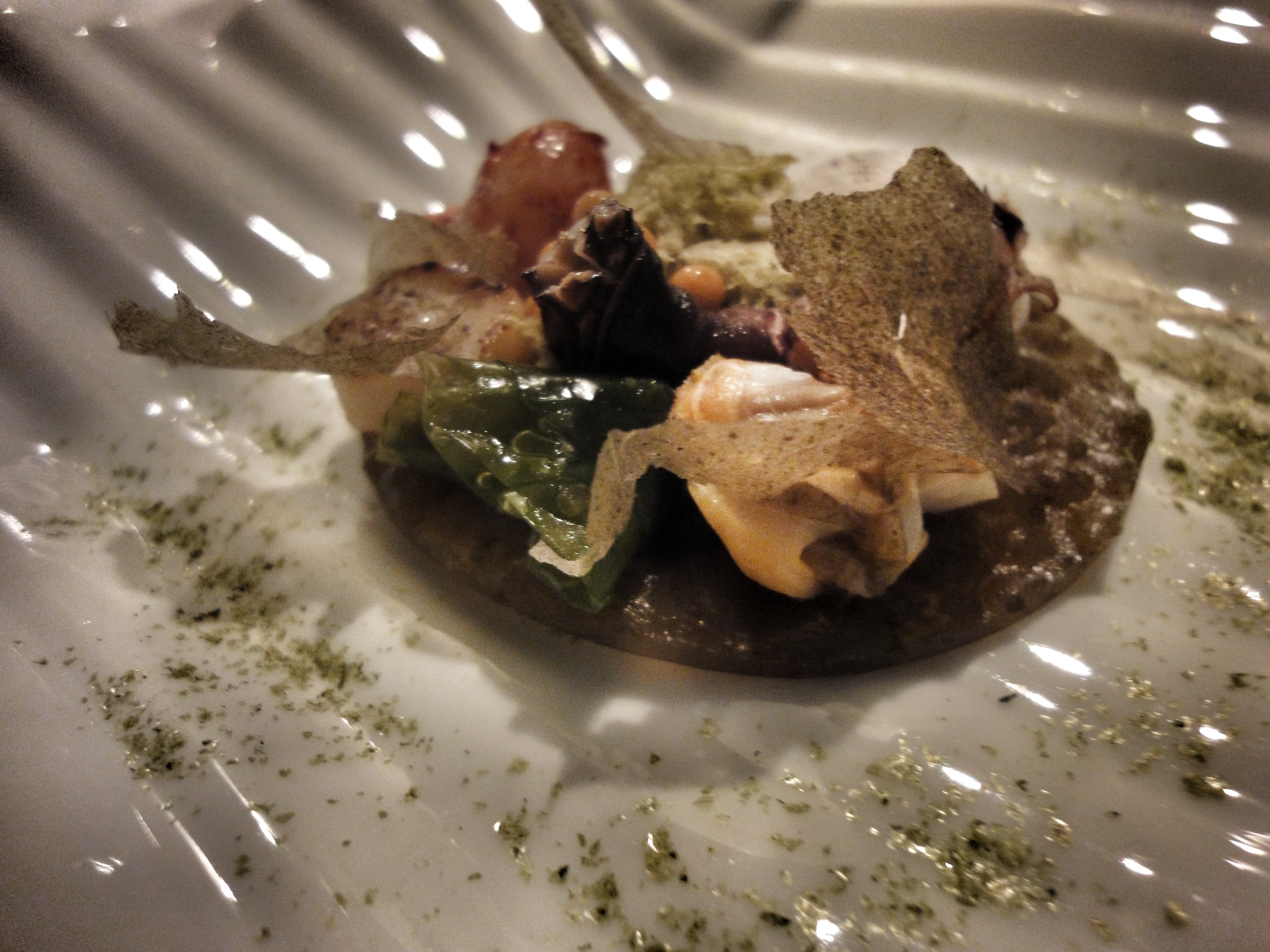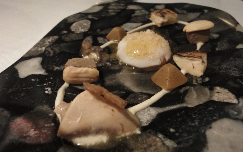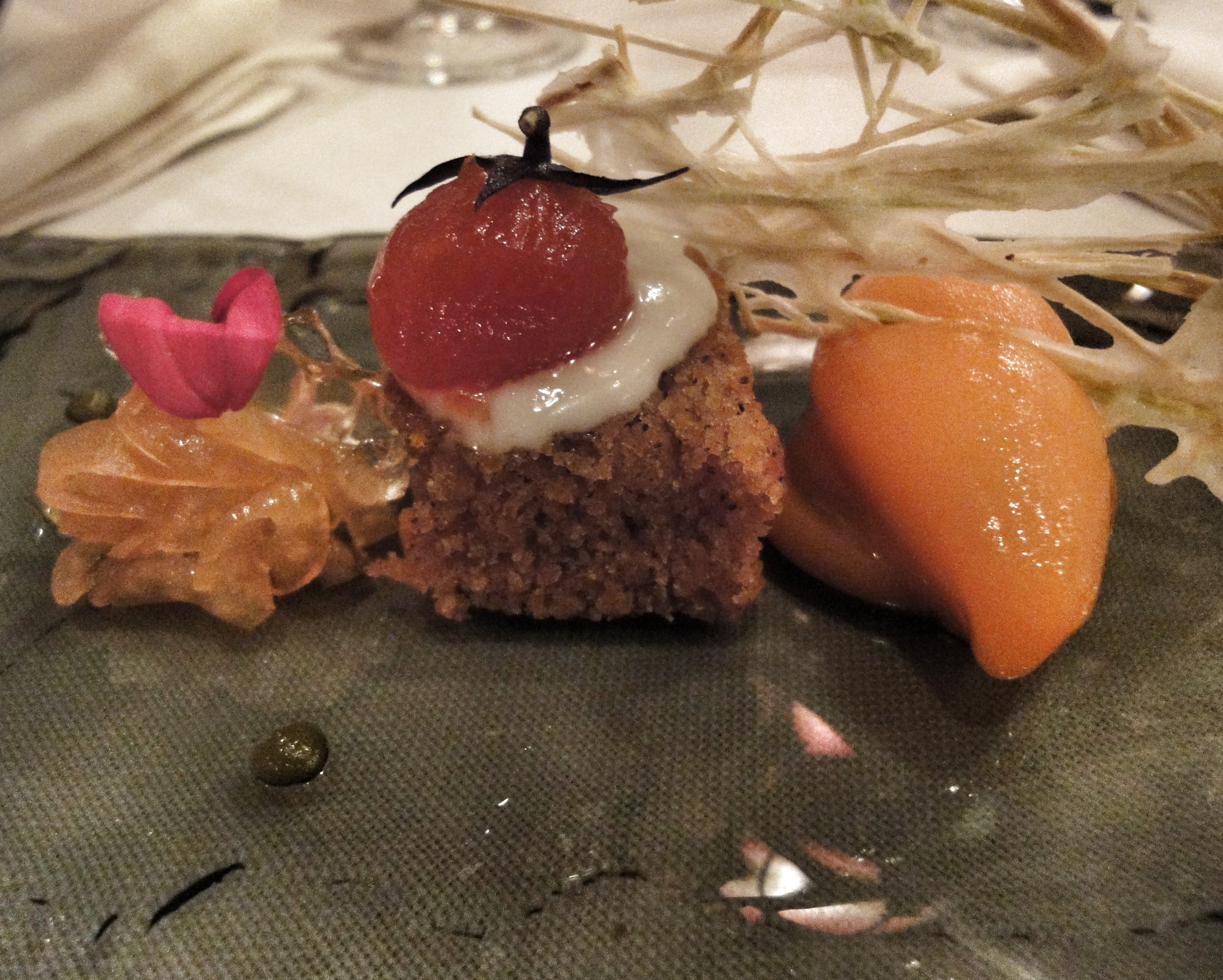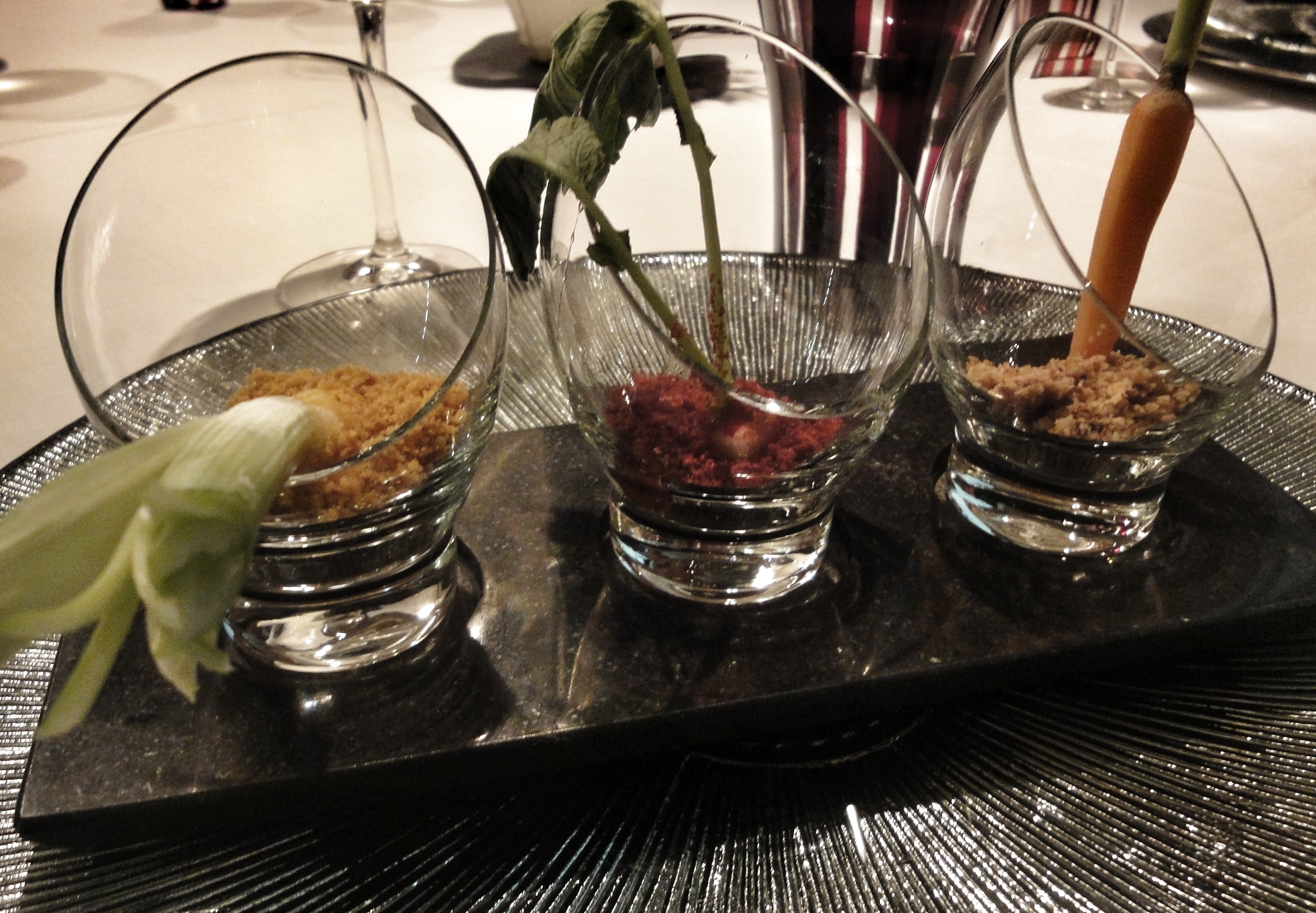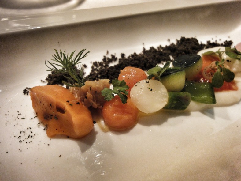 El primer plato que nos pusieron delante fue la huerta de Mario Sandoval: puerro con tierra orgánica de cebolla (puerro con raíces crujientes cubierto de tierra de almendras y cebolla tostada), zanahoria encurtida en crocante de maíz (maceta de tierra orgánica de maíz con zanahoria encurtida en pulpa) y rábano osmotizado en soja con remolacha (mini rábano osmotizado en soja, chili sauce y vinagre cítrico bajo tierra de remolacha).