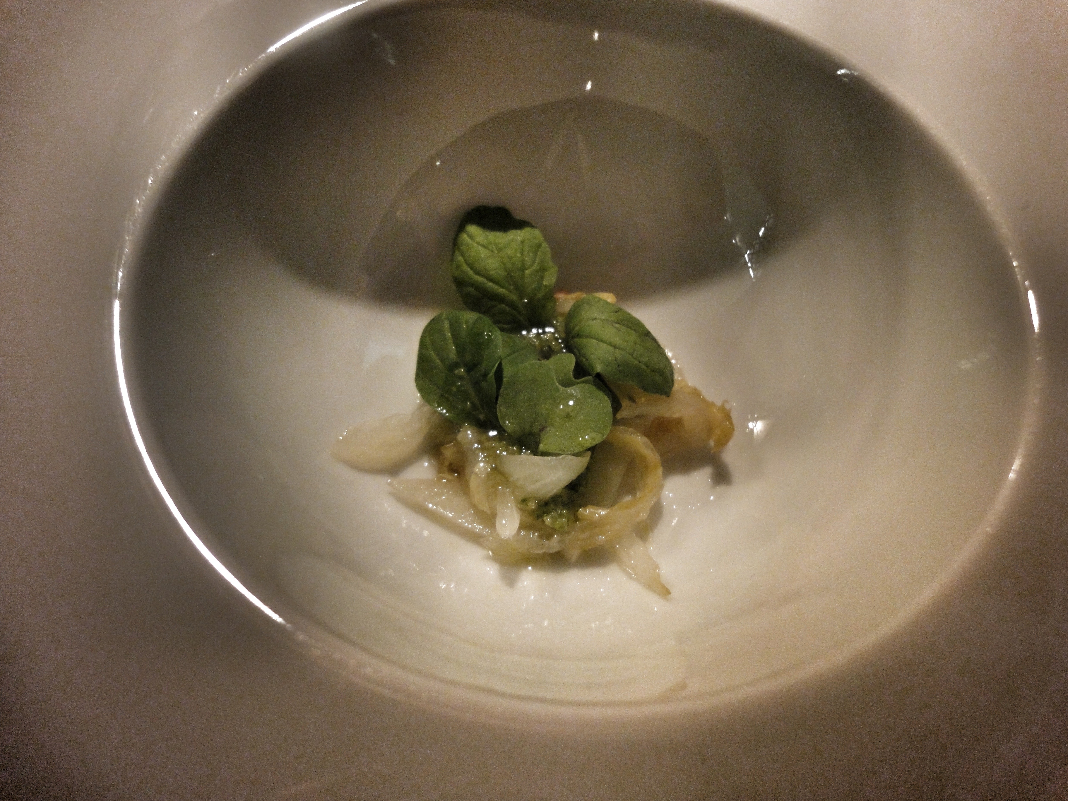 Llega a la mesa un plato que nos dijeron que se llamaba Lechuga, pero delante teníamos quenel de cogollo de lechuga y endivia con brotes.
