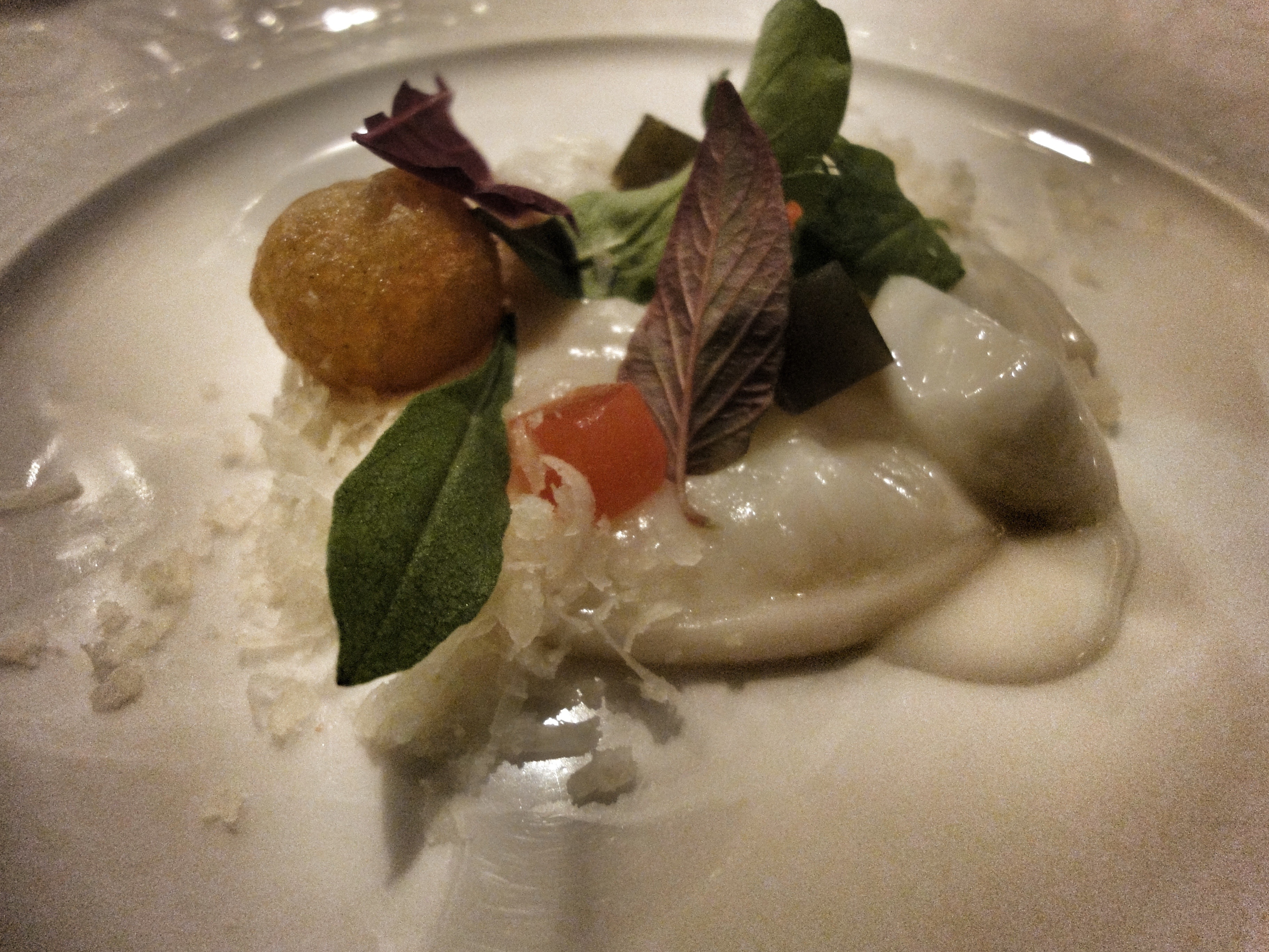 Huevo de gallina: huevo nitro de vichyssoise con crema parmentier especiada. El Chef nos recomendó comer la parte superior con los dedos para poder captar mejor el sabor del huevo y terminar el plato con la cuchara.