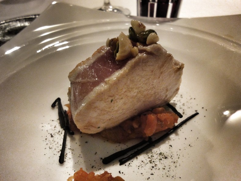 Bonito a la brasa con tomate y frutos secos: bonito marcado a la plancha y ahumado sobre tomate, con vinagreta de frutos secos y ceniza de verduras.