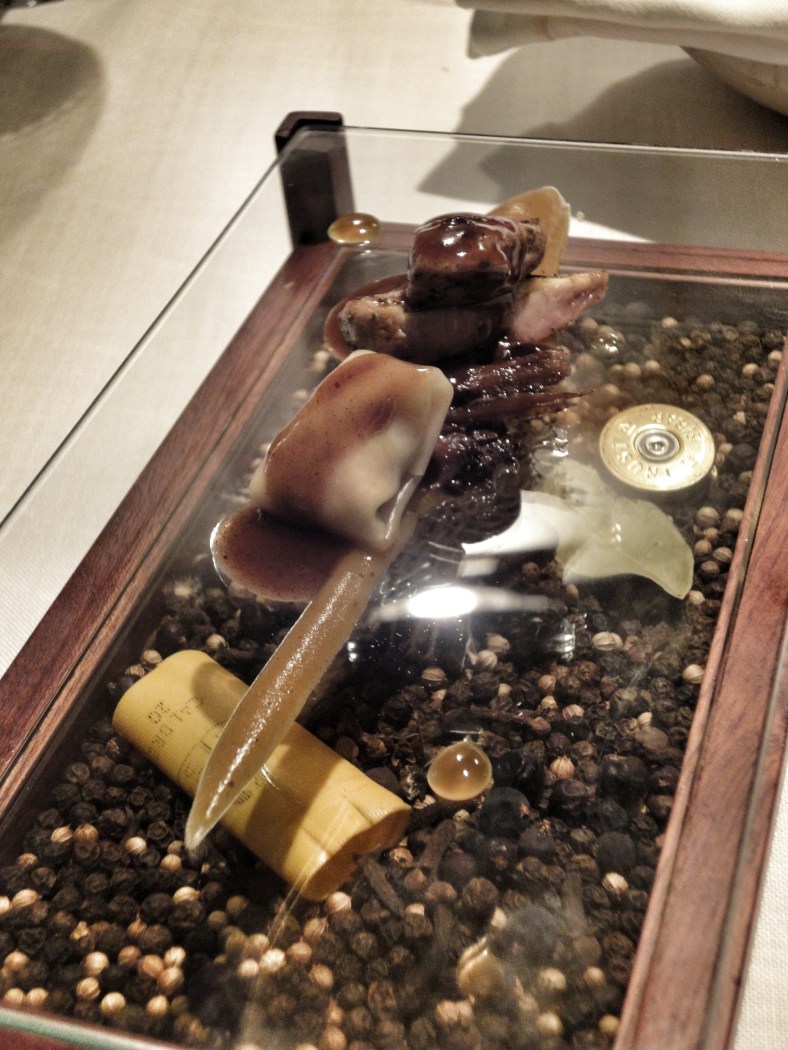Codorniz Ortolans con ravioli de langosta: pechuga, puré y muslo de codorniz con gelatina de zanahoria caliente, contra ravioli de langosta y viera.