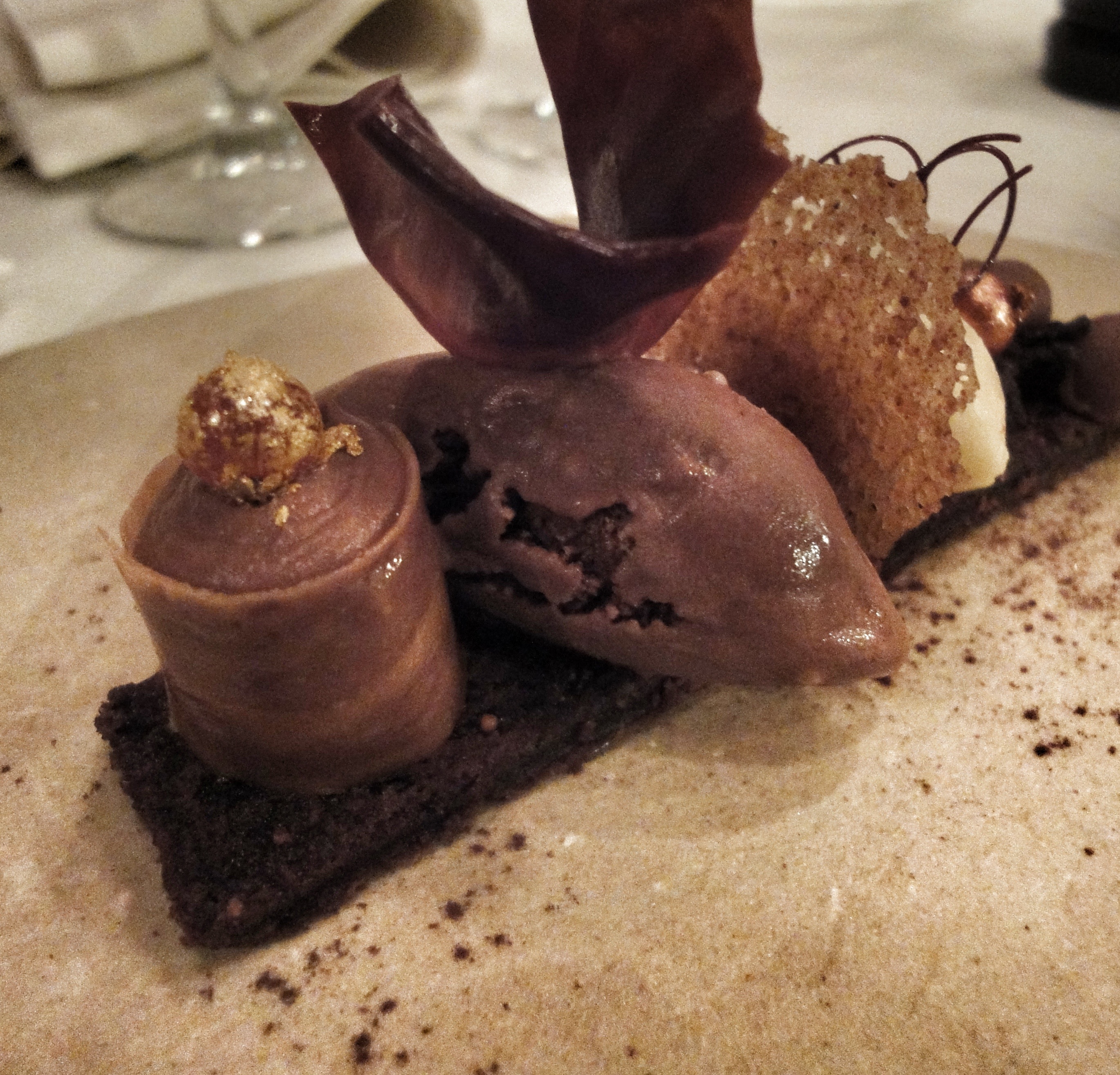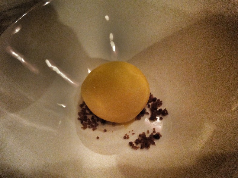 De los postres, lo que más me gustó, fue el Bombón de guianduja y azafrán, porque me sorprendió, no pensé que esa concha con rayas azules pudiera hacerme repetir aunque estuviera llena.
