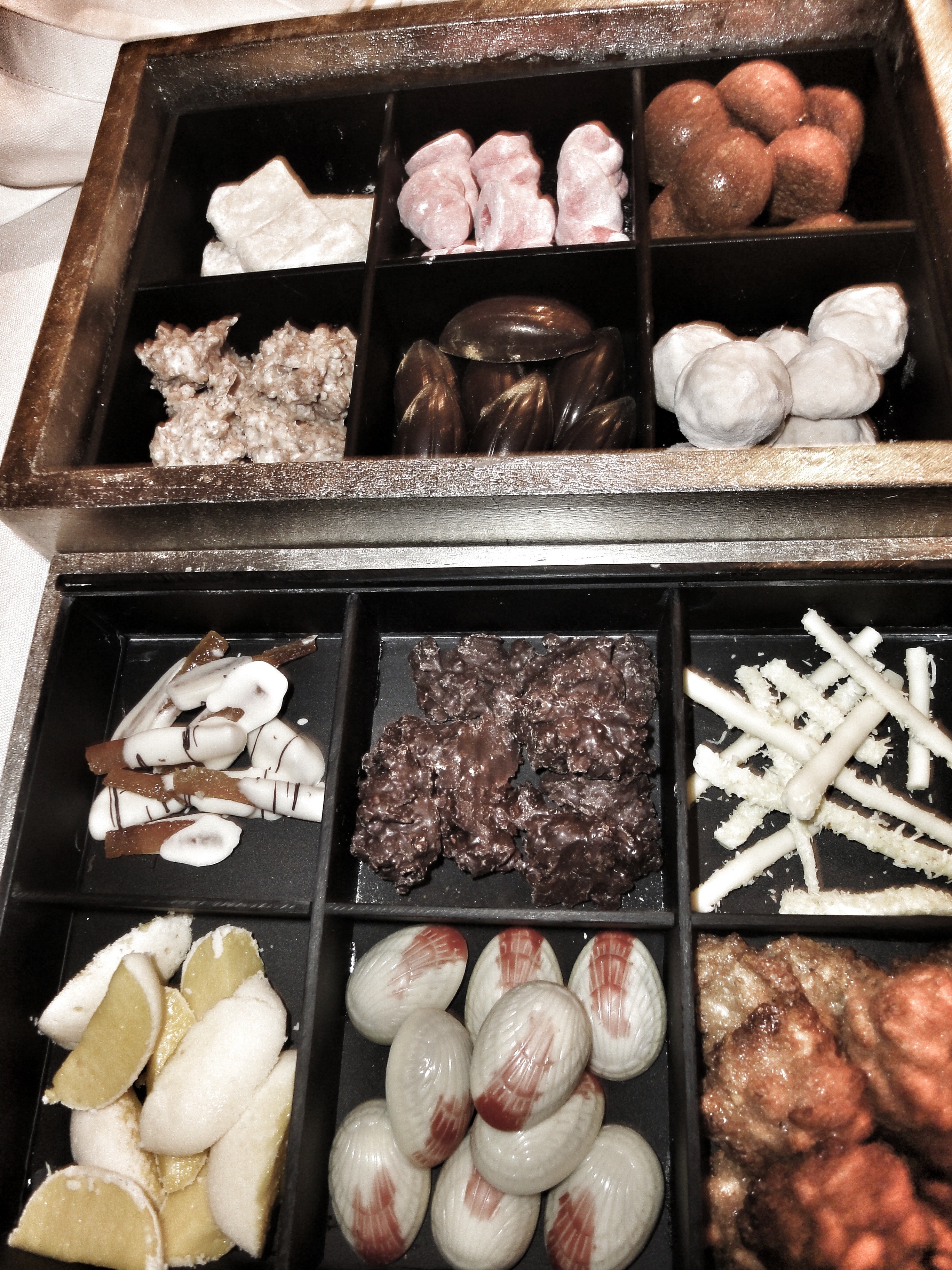 Y en una caja consiguieron meter 12 postres más, los llamados «Petitfours»: Bombón de yuzu (ganache de limón con cobertura de chocolate negro), Nube de naranja sanguina (botones de puré de naranja sanguina), Bombón de guianduja y azafrán(bombón blanco con praliné de azafrán y avellanas), Roquita blanca de frambuesa (pasta de frambuesa que se transforma en burbujas en la lengua), Garrapiñado de piñones (isla horneada de piñones con recuerdo de café), Esponja de frutas exóticas (esponja de puré de mango y fruta de la pasión), Merengue de frambuesa (delicados y esponjosos merengues con un toque de frambuesa), Naranja escarchada (naranja confitada en su almíbar), Roquita de maíz (bloques de chocolate negro especiado con maíz crujiente), Trufa de pasión (aromáticos bocados de fruta de la pasión), Financier de anís (borrachito de pistacho o cacao con jarabe de anís), Chocolate con coco y curry (exquisito chocolate con coco y un punto de curry).