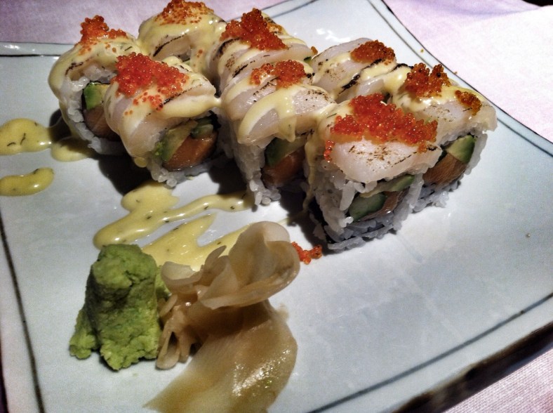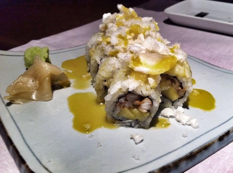 • Dragon Maki: maki de langostino tempurizado en panco, buey de mar y aguacate cubriendo el arroz. Se nota la calidad del restaurante en: las cantidades de pescado que llevan los makis, lo bien hecho que está el arroz y la buena calidad de las materias primas auxiliares como: queso crema, aguacate, huevas de pez volador…