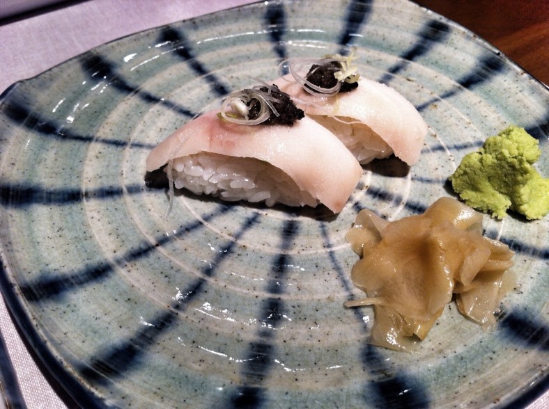 Tras el buen sabor de boca que nos habían dejado las gyozas nos trajeron el nigiri de pez mantequilla con trufa negra por encima. Nunca olvidaré la cara de Luis mientras comía este pequeño manjar, que tiene un tamaño tan considerable que difícilmente entre en la boca :).