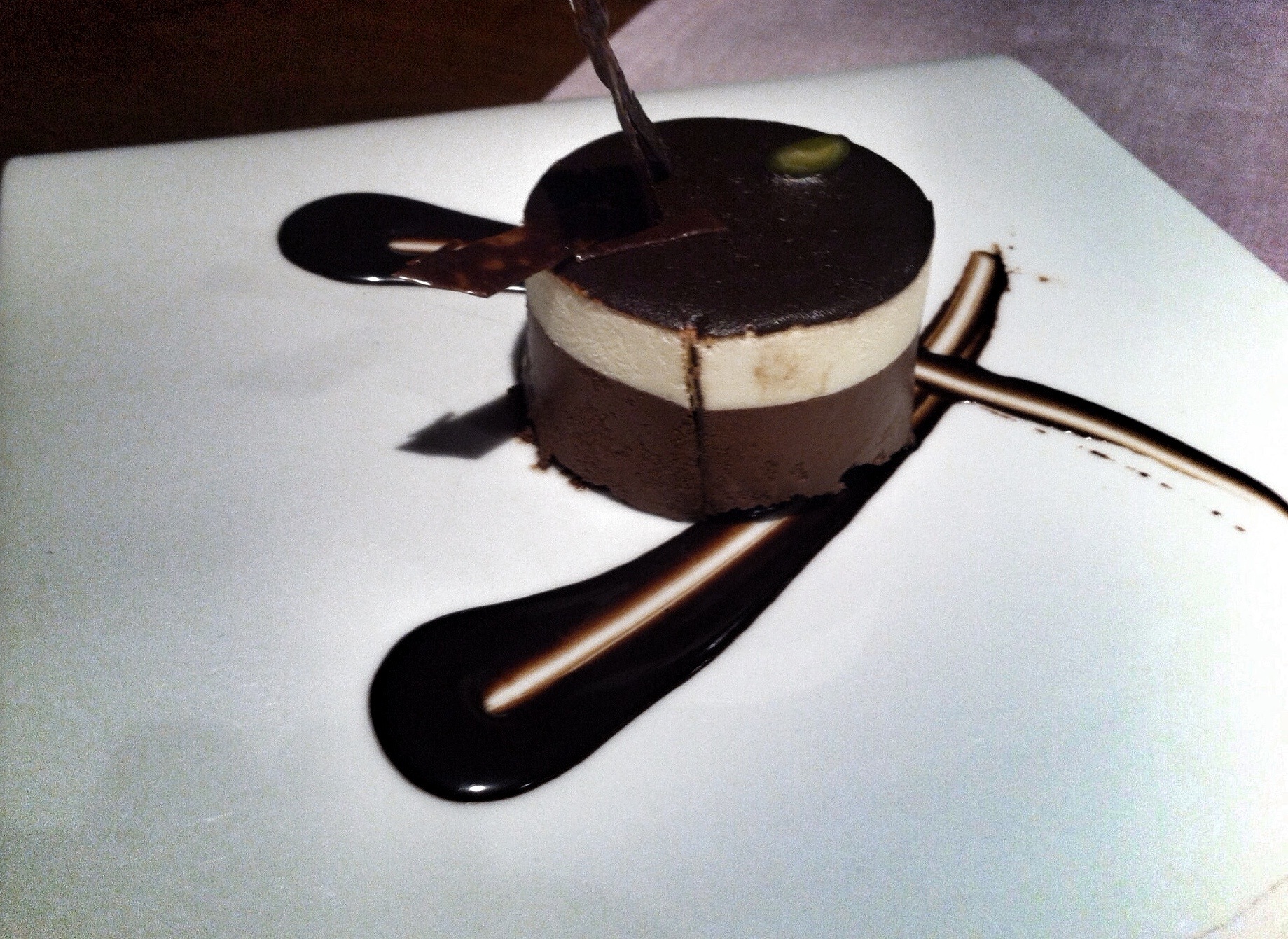 De postre, el camarero nos convenció para pedir una tarta de tres chocolates, una capa de chocolate con leche, una capa de chocolate blanco (que era nata) y la capa de arriba de chocolate negro. Lo mejor el crujiente de frutos secos que había por encima, porque la tarta era demasiado chocolate para mi.