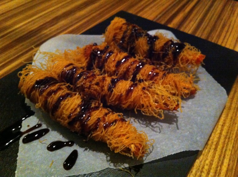 Unas brochetas de langostino crujientes, para mi, lo mejor de toda la cena, tanto por el tamaño y la frescura del langostino, como por la forma en la que estaba rebozado y la salsa que lo acompañaba.