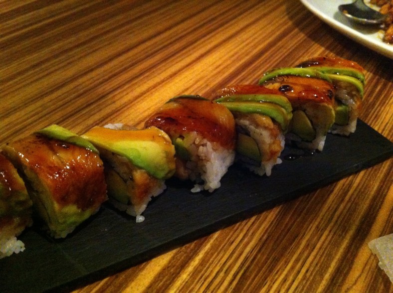 También nos trajeron un Dragon Maki, hecho a base de salmón y pepino por dentro y anguila y aguacate por fuera. Me gustó la salsa que los baña.