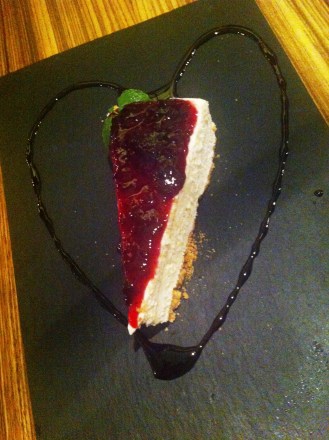 Por último, de postre tomamos una maravillosa tarta de queso. Todas las mañanas hornean un par de tartas de queso junto con un brownie y normalmente se les suelen acabar al mediodía, porque son los 2 postres con más éxito del menú del día. La verdad es que estaba tan rica, que no me hubiera importado tomarme otro trozo a medías con Luis :).