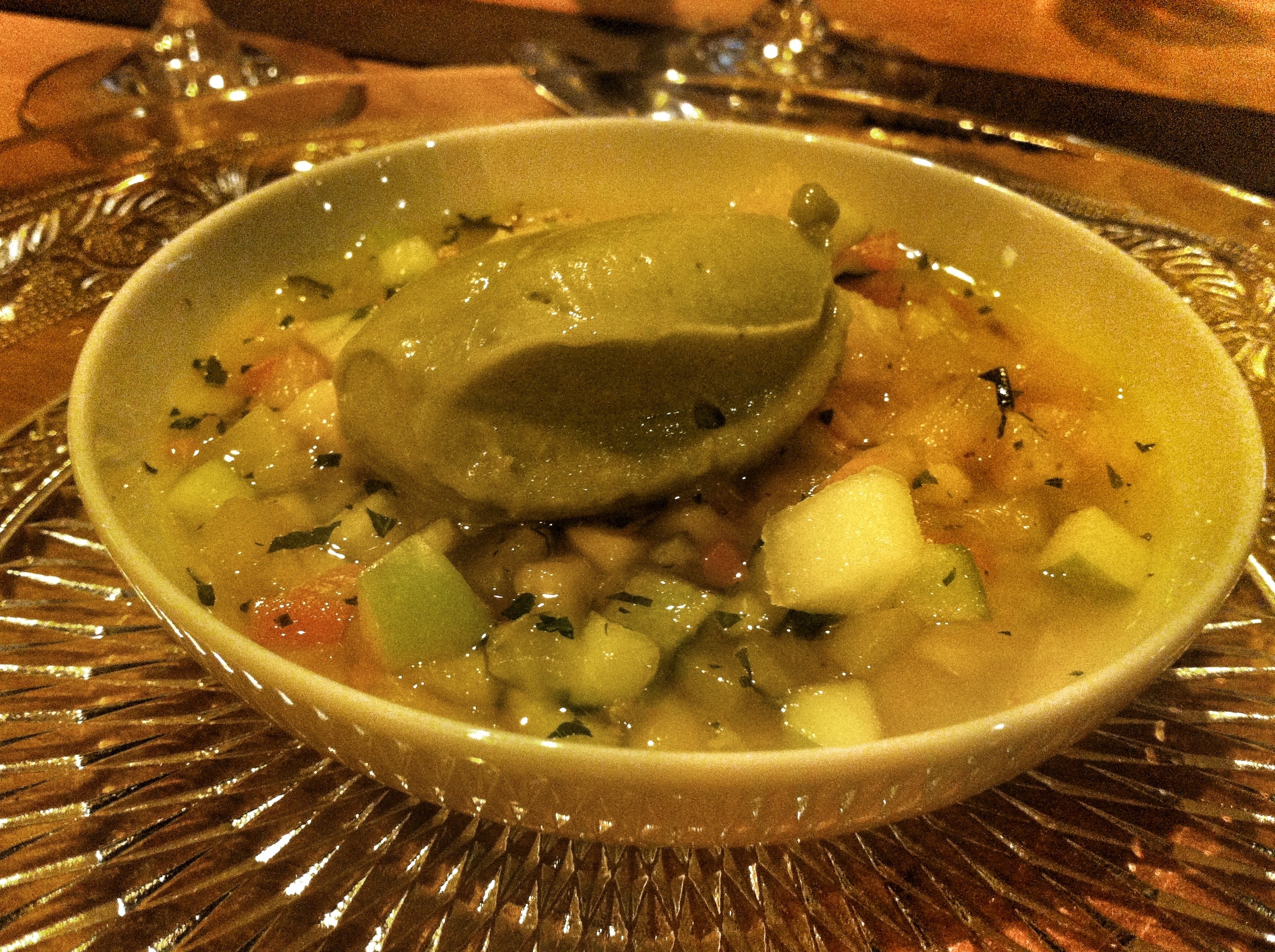 De postre preparamos una macedonia de frutas y verduras con helado de té verde. Lo más complicado de este plato fue cortar todos los ingredientes, porque el chef insistió mucho con el tamaño uniforme de todo para conseguir un mayor sabor. Importante para este plato, hacer un buen almíbar y servir muy frío ;).