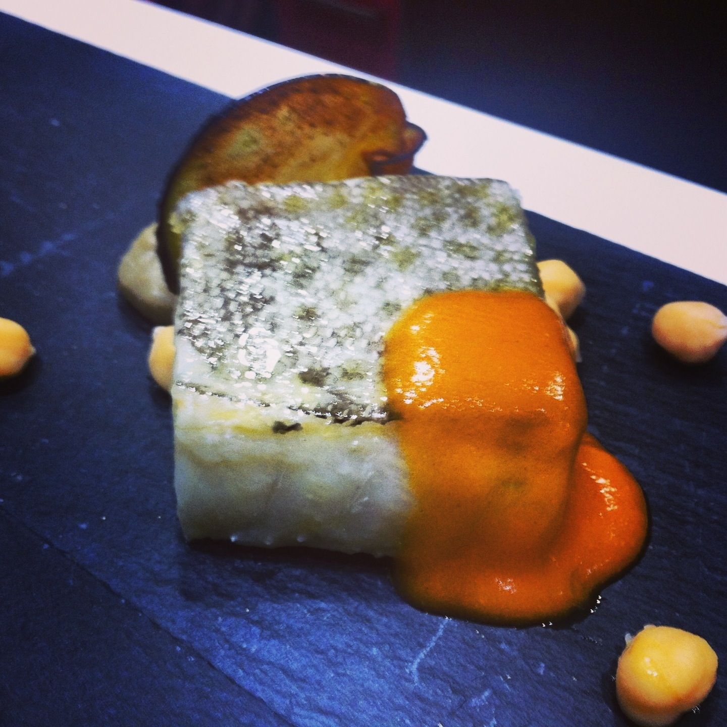 El equipo 3 (@miotraella, @jlastras, @BorisJodar y @cocinaaficiones) hicieron un bacalao confitado al aroma de Pedroñeras con una falsa salsa bilbaína, puré de berenjenas y chips de berenjenas. La clave de este plato es conseguir unos buenos lomos de bacalao.
