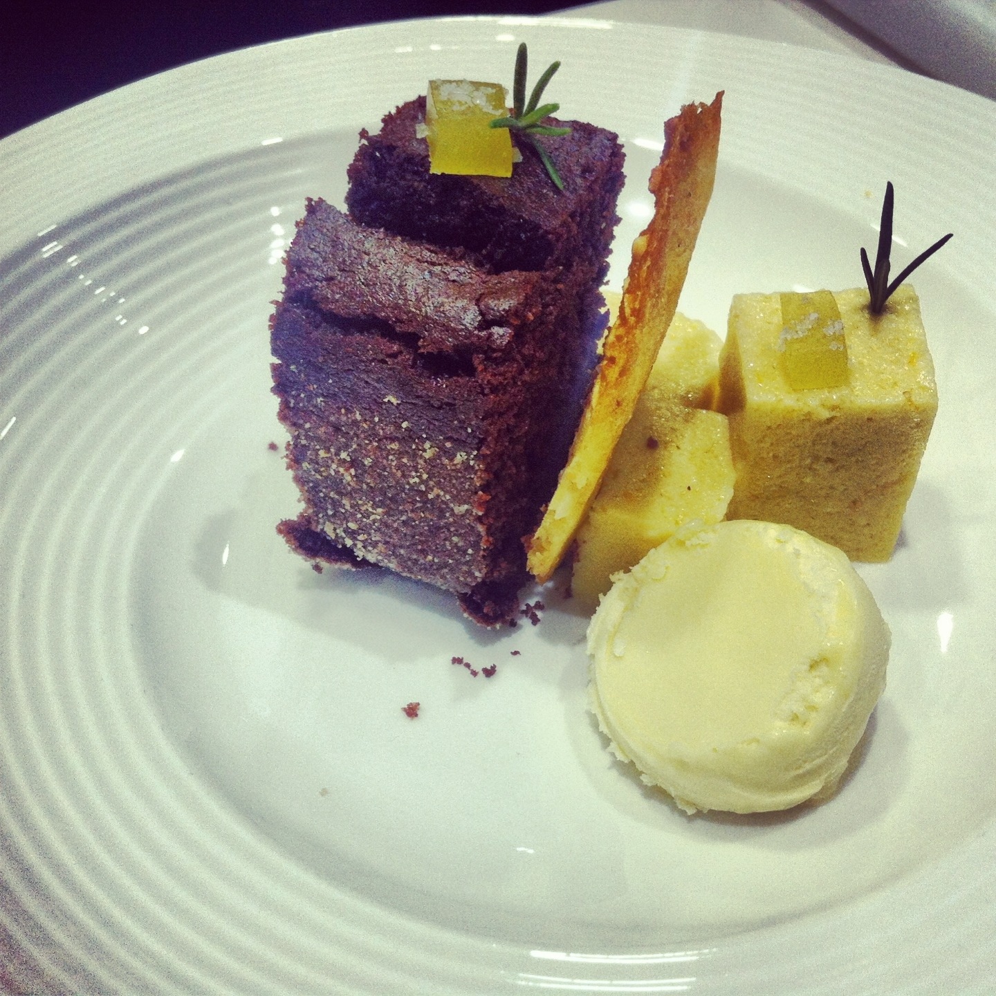 Y el equipo 4 (@caminarsin, @mumumio, @SecocinaCom y Alfredo) fueron los encargados del postre, que no llevaba nada de gluten: chocolate, naranja y aceite en diferentes texturas. La gominola de aceite de albahaca, cuando tocaba las papilas gustativas con el chocolate y el helado era una fiesta de sabores inexplicable. Lo que destacaría de este plato son las natillas en textura de flan…deliciosas :).