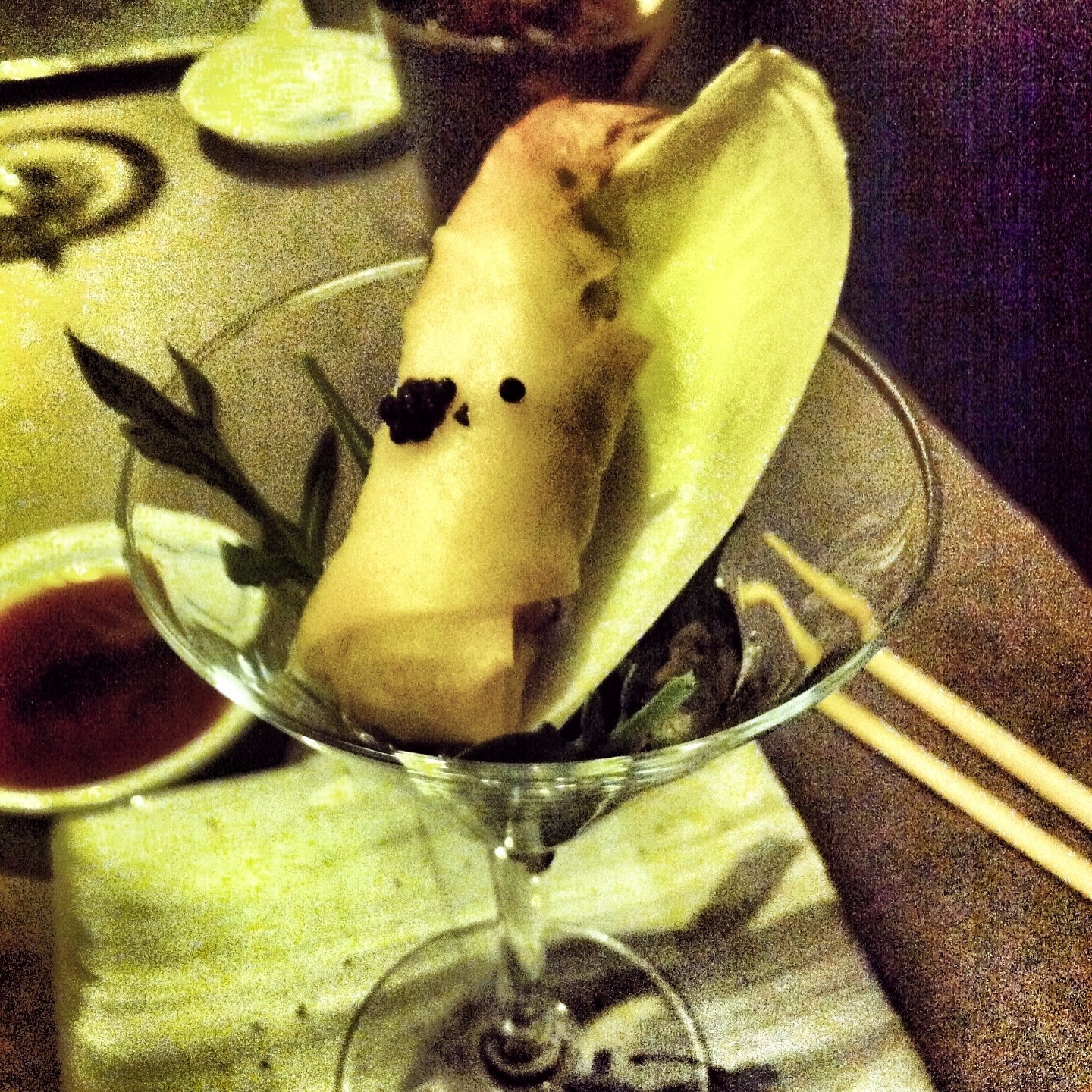 Siguiendo las recomendaciones de nuestra amiga Jana de Aires Newspedimos el Harumaki de langostino con rúcula, endivias con salsa agridulce. Menuda combinación de ingredientes…estaba riquísimo.