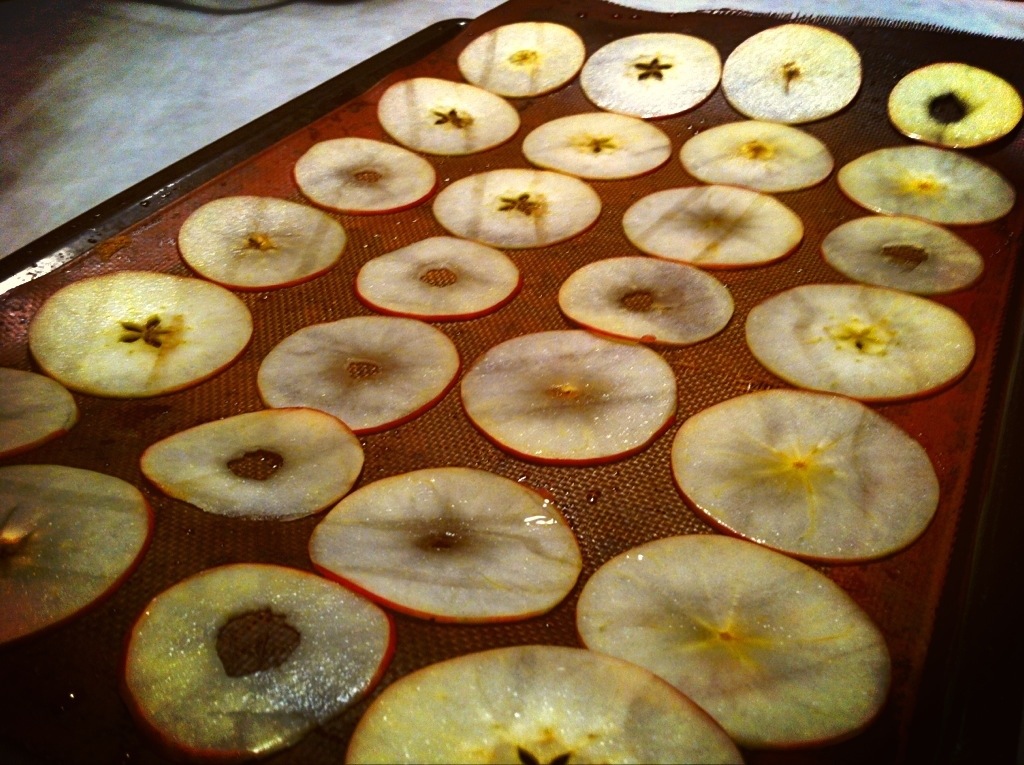 Introducimos los chips en el horno, durante dos horas, para que se deshidraten. Es importante dar la vuelta a las manzanas a la hora, para que se hagan por ambos lados.