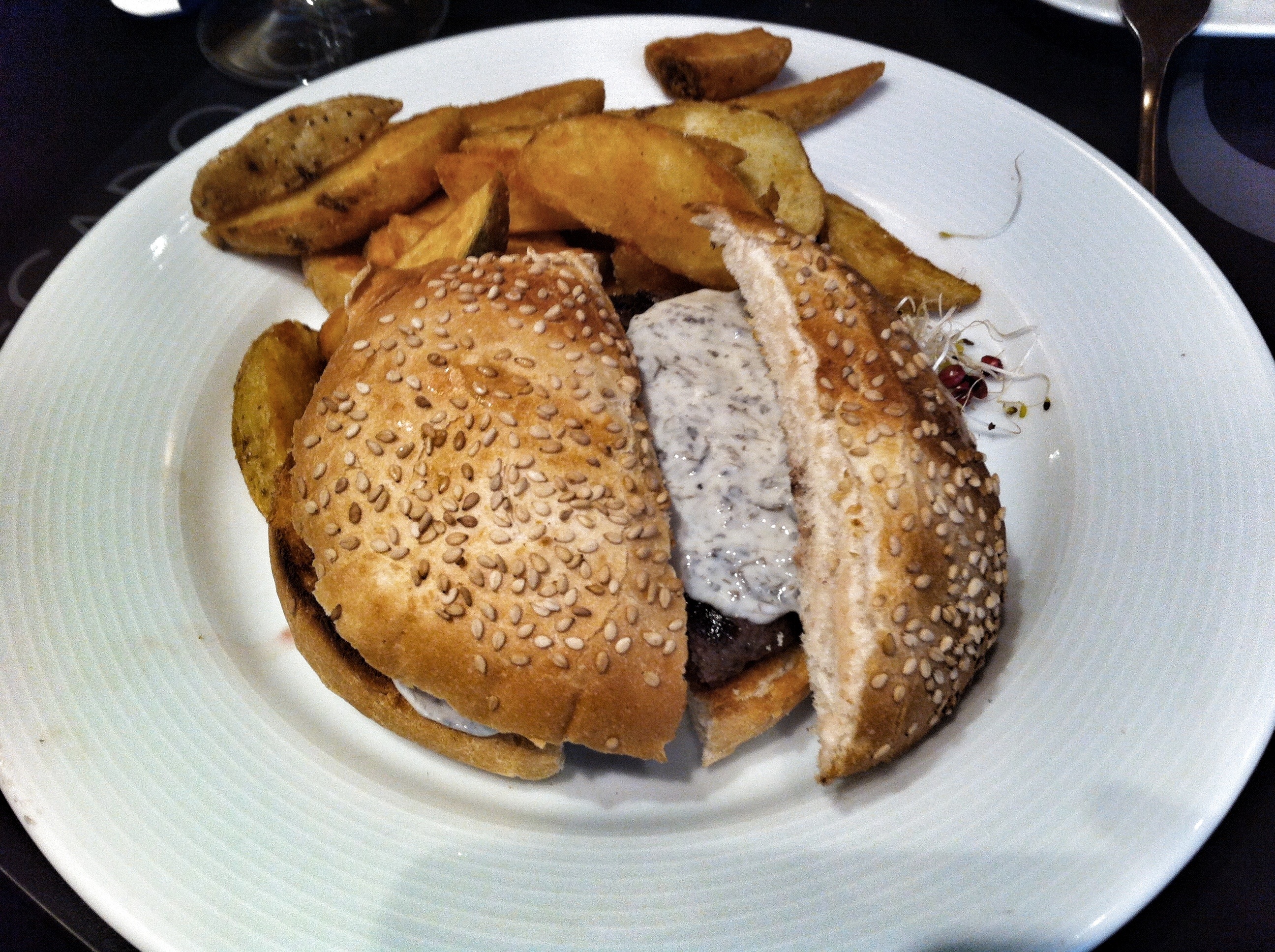 Llegó el turno de las famosas hamburguesas de buey de wagyu (en japonés «wagyu» significa ganado japonés) de Kobe (es la región de Japón de donde procedían originalmente las vacas, que han sido cruzadas y criadas aquí). Nos trajeron dos para que compartiéramos. Una black garlic kobe burger, hamburguesa de ajo negro japonés confitado, que importan desde Japón y sirven con mayonesa…verdaderamente deliciosa y singular, acompañada de patatas gajo caseras, que condimentan ellos mismos con sal, pimienta, tabasco y más especias que no podían decirme ;).