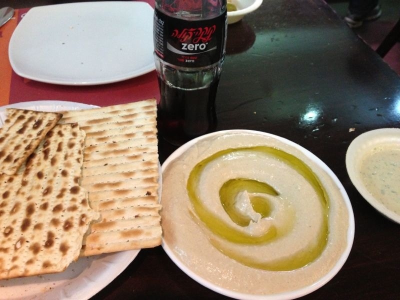 No hemos podido disfrutar al 100% de su gastronomía porque durante la semana de Pascua (“Pesaj” como ellos la llaman), los judíos  no pueden tomar alimentos derivados de cereales fermentados (trigo, cebada, centeno, avena y espelta). Cuando te sientas a la mesa, te traen una cesta con pan ácimo («Matzá», en hebreo) y las cartas de los restaurantes son especiales…sin nada de pan de pita, cerveza, pasta, pizza o pasteles :(. Han creado con fécula de patata: pasta, panes de hamburguesas, pizza y otras versiones de comidas rápidas para poder comerlas :).