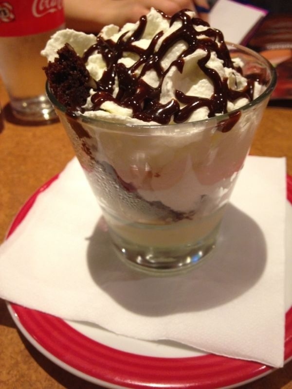 Y después de esta cantidad de calorías, terminamos nuestra comida con un vasito de brownie con helado de vainilla. Para mi gusto tiene demasiada nata y poco bizcocho…yo pondría solo helado de vainilla y un buen trozo de brownie, que cuando está calentito…es una delicia.