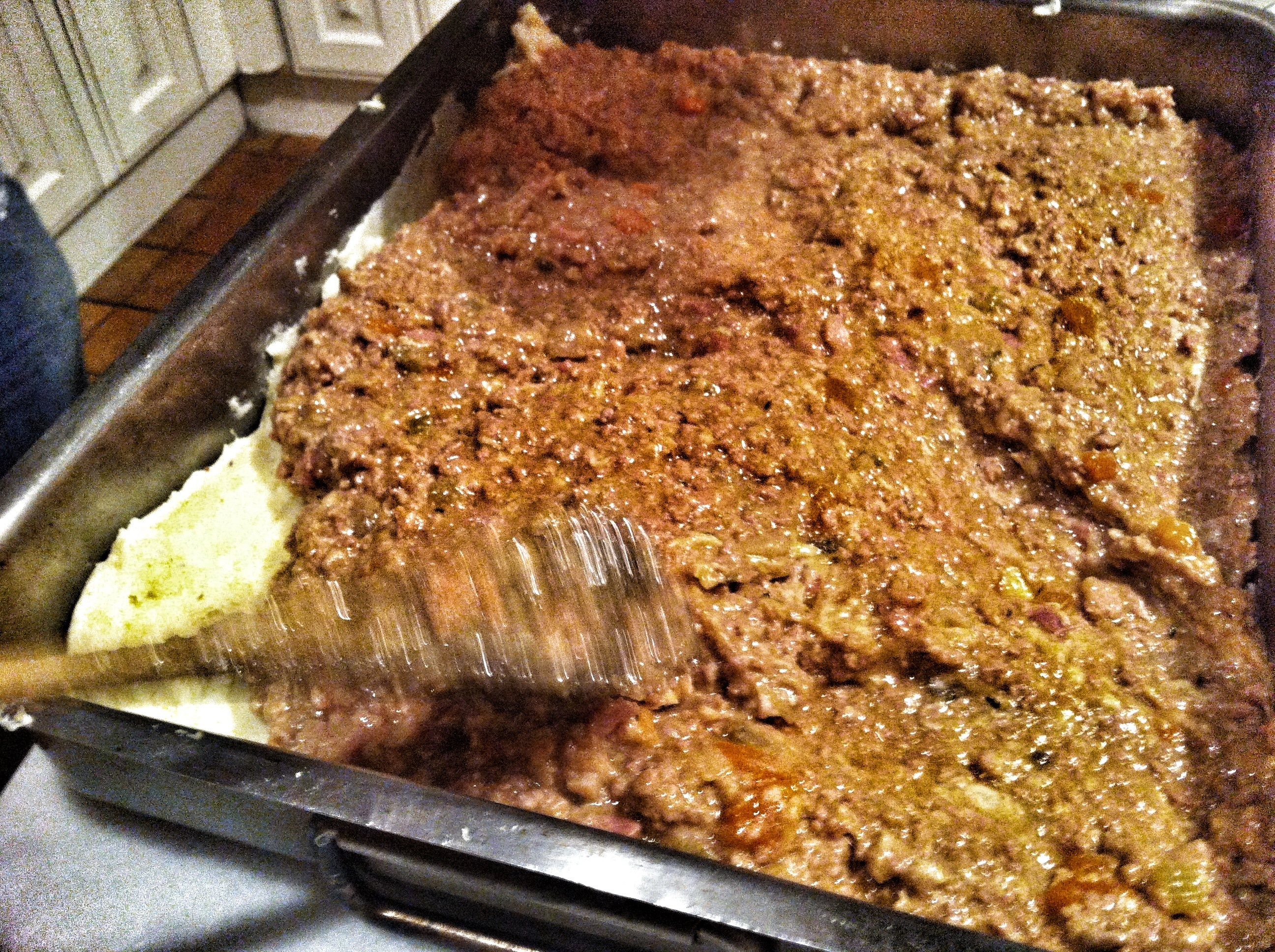 Una capa de puré, una capa de carne y una de puré