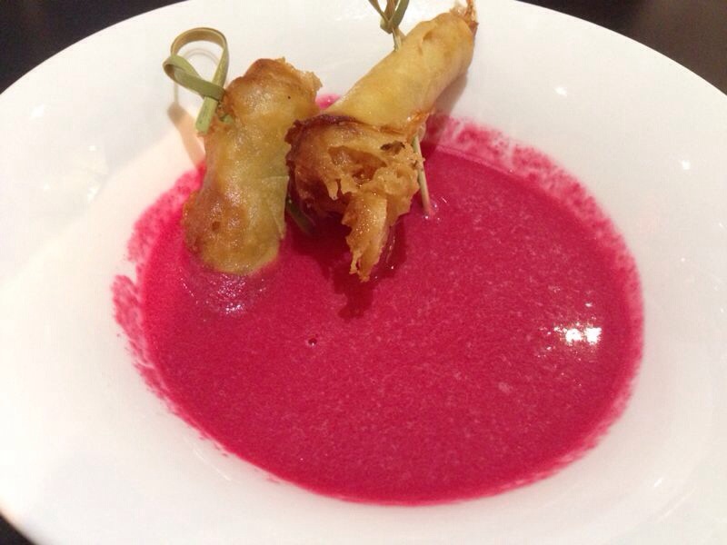Nuestra cena fue una degustación de tapas variadas empezando por el famoso Gazpacho de remolacha con crujiente de langostino, del que llama la atención el color del plato. Un plato muy fresquito, perfecto para la temporada de verano.