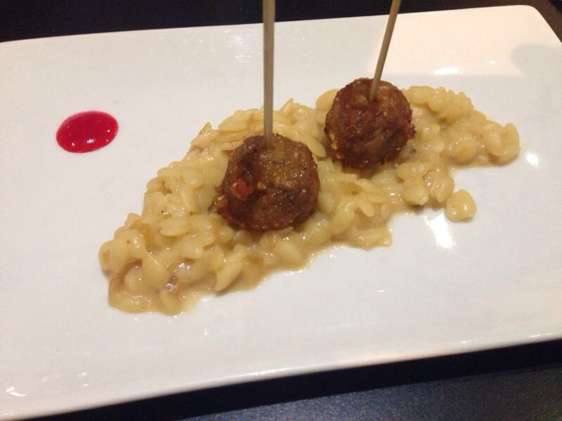 Pudimos probar la carne de canguro en una tapa que se ha incorporado recientemente a la carta tras el éxito que tuvo en la Feria de la Tapa en Majadahonda: la albóndiga de canguro envuelta en kikos y acompañada de un falso risotto.