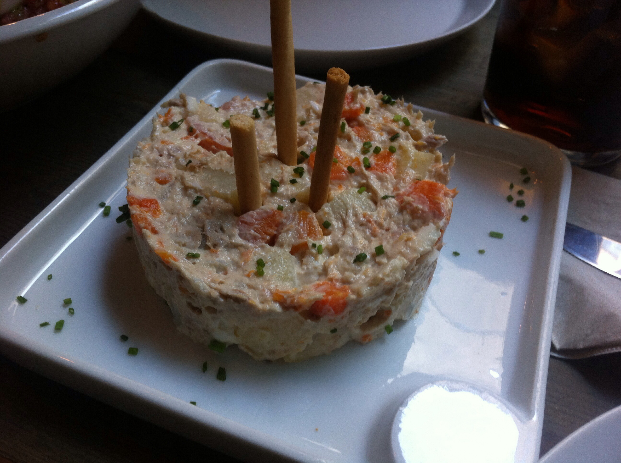 Nosotras pedimos, influidas por las recomendaciones de Natalia y Jesús de Cooking and Disfruting,la ensaladilla rusa, que hacen sin guisantes, cosa que emocionó mucho a Coco…porque no es muy fan de este ingrediente 🙂 :). Me impresionó la cremosidad y lo bien hecha que estaba, porque no en todos los sitios saben hacerla.