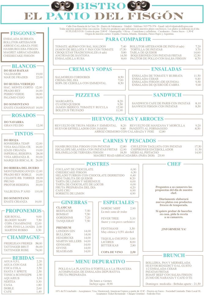 Mi recomendación: si estáis por el Barrio de Salamanca, os apetece picar algo en un sitio mono y topáis con un local donde prima la inspiración mediterránea, en menú y decoración, y veis muchas fotos en las paredes…habréis dado con el sitio correcto: «Patio del Fisgón«. Cómo curiosidad diré que todas las fotos que hay en la pared y marcos de los cuartos de baño son fotos familiares de los socios y sus familias :). Cenar sale por 20 euros/persona sin vino.