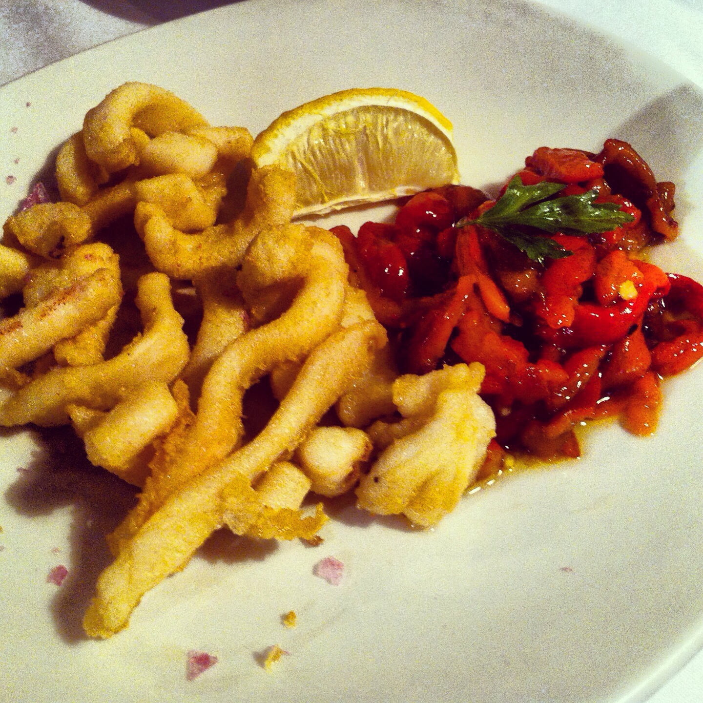 Cómo era una comida de picoteo, no podían faltar en la mesa las rabas que aquí las sirven con pimientos asados. Con una fritura ligera y un toque muy mediterráneo, acabamos con los calamares de anzuelo en un abrir y cerrar de ojos.