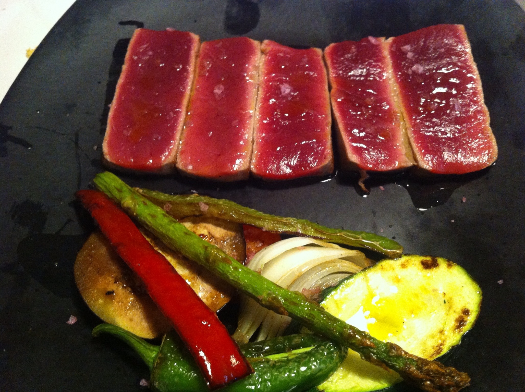 Luego probamos el atún rojo vuelta y vuelta con unas verduras a la plancha. Otro plato ligero, en el que nos demuestran lo importante que es para ellos la calidad de la materia prima y la preparación de cada plato.