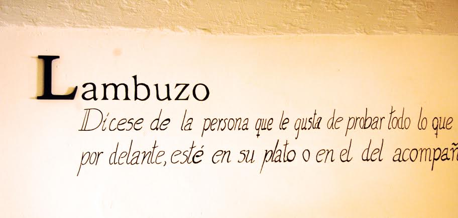 Nada más entrar, en una de las paredes de la barra, se puede leer «Lambuzo: dícese de la persona que gusta de probar todo lo que le pongan por delante…esté en su plato o en el del acompañante»…no sabíamos que eramos unos lambuzos hasta que vinimos hace un par de semanas 😉