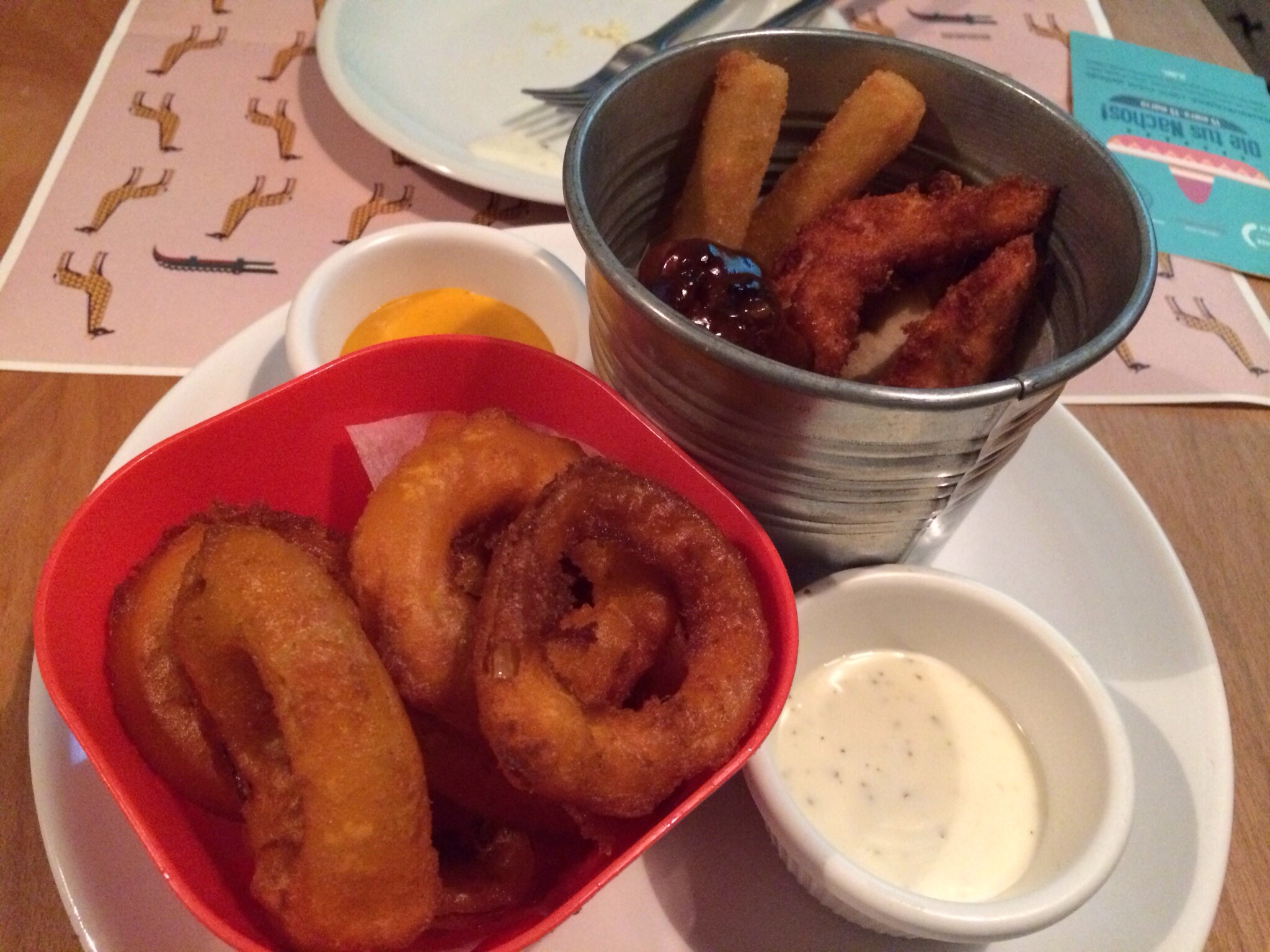 Otro entrante perfecto para parejas indecisas es el combo para 2, donde podréis probar los aros de cebolla, las flautas de pollo, los palitos de queso cremoso y las alitas de pollo con salsa barbacoa. Todo es casero y se nota…rebozados finos, formas diferentes, sabores auténticos y dos salsas para mojar (cheddar y salsa ranchera) pero yo cambiaría una de las dos por salsa barbacoa, porque está buenísima 😉 .
