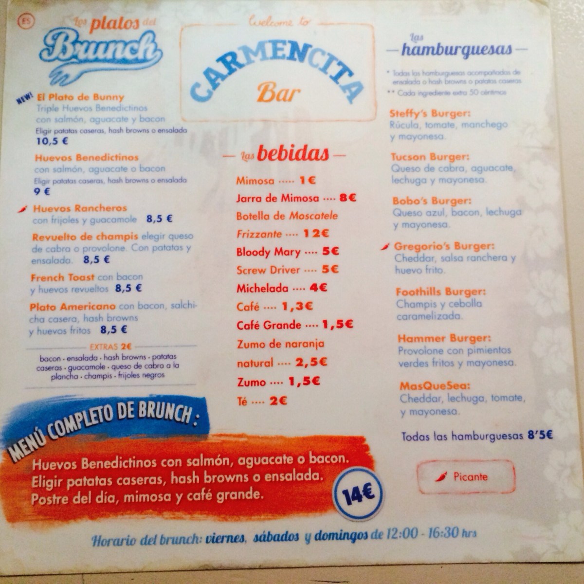 20140206-115712.jpg Publicado 6 de febrero de 2014 en 2048 × 2048 en Carmencita Bar ← Anterior Siguiente → Menú brunch viernes, sábados y domingos 40.426147 -3.707358