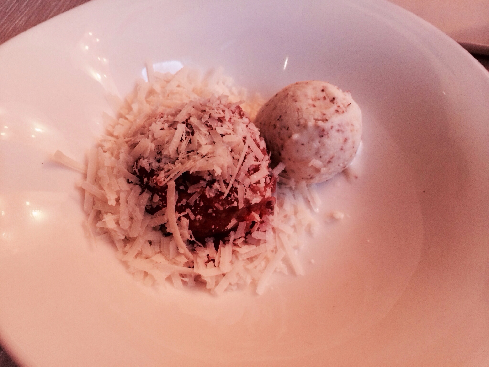 Los platos por los que nos decantamos fueron el steak tartar con helado de mostaza y lascas de parmesano, que os recomiendo que toméis mezclando el helado con la carne para potenciar el sabor del conjunto 🙂 . Es una ración pequeñita, por lo que si sois amantes de este plato, mejor pediros uno steak tartar sólo para vosotros…aunque os quitarán un poco los demás seguro.