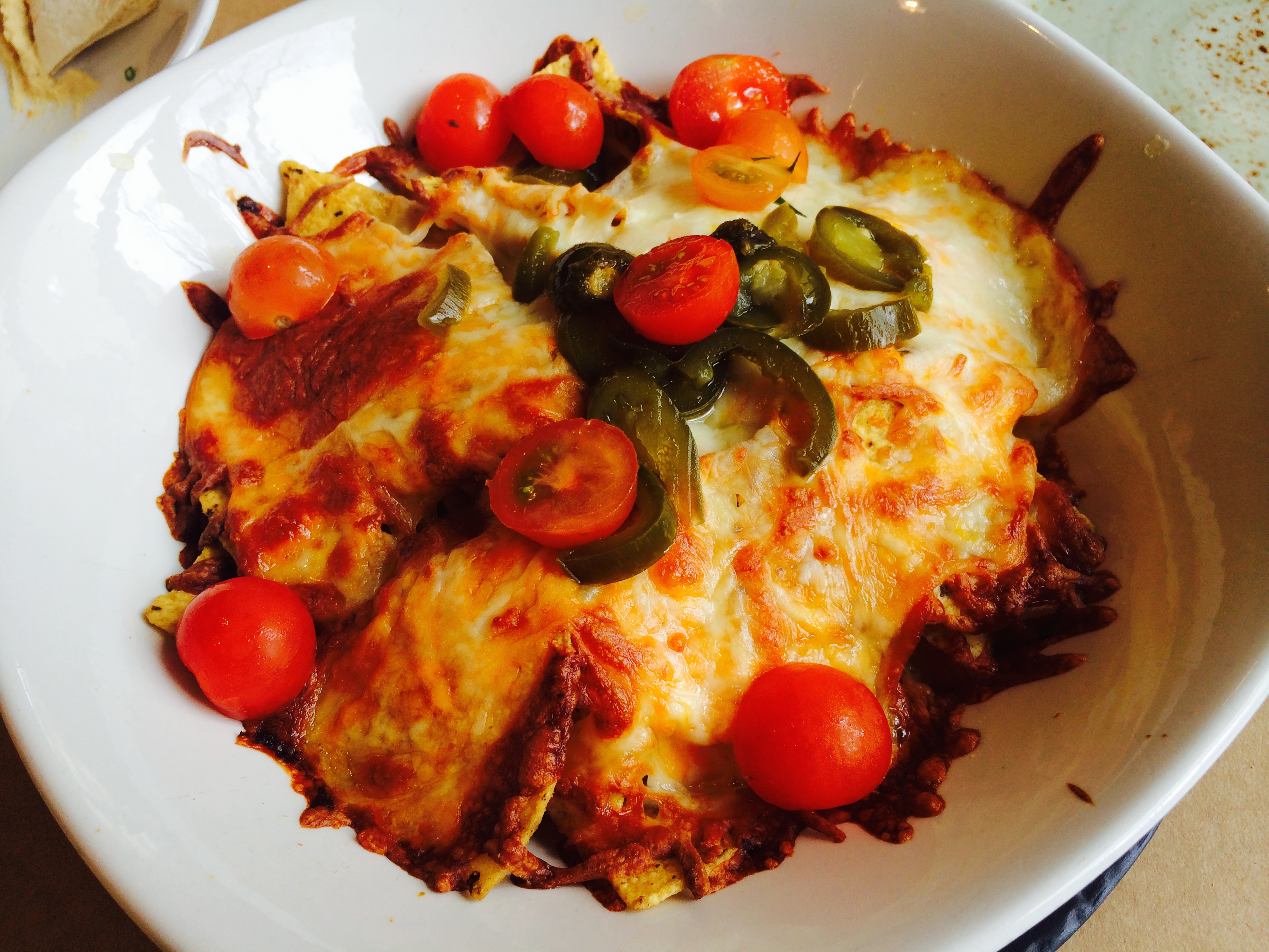 Nosotros nos decantamos por compartir unos nachos con queso, que sirven con suficiente queso, jalapeños de los que hacen que te queme la lengua y una buena vinagreta de tomate y cebollita 🙂 . Por mucho que intento hacer este plato en casa, siempre se me quedan sin queso los nachos de abajo y aquí consiguen que los triangulillos de maíz vayan acompañados siempre de un poquito de queso fundido.