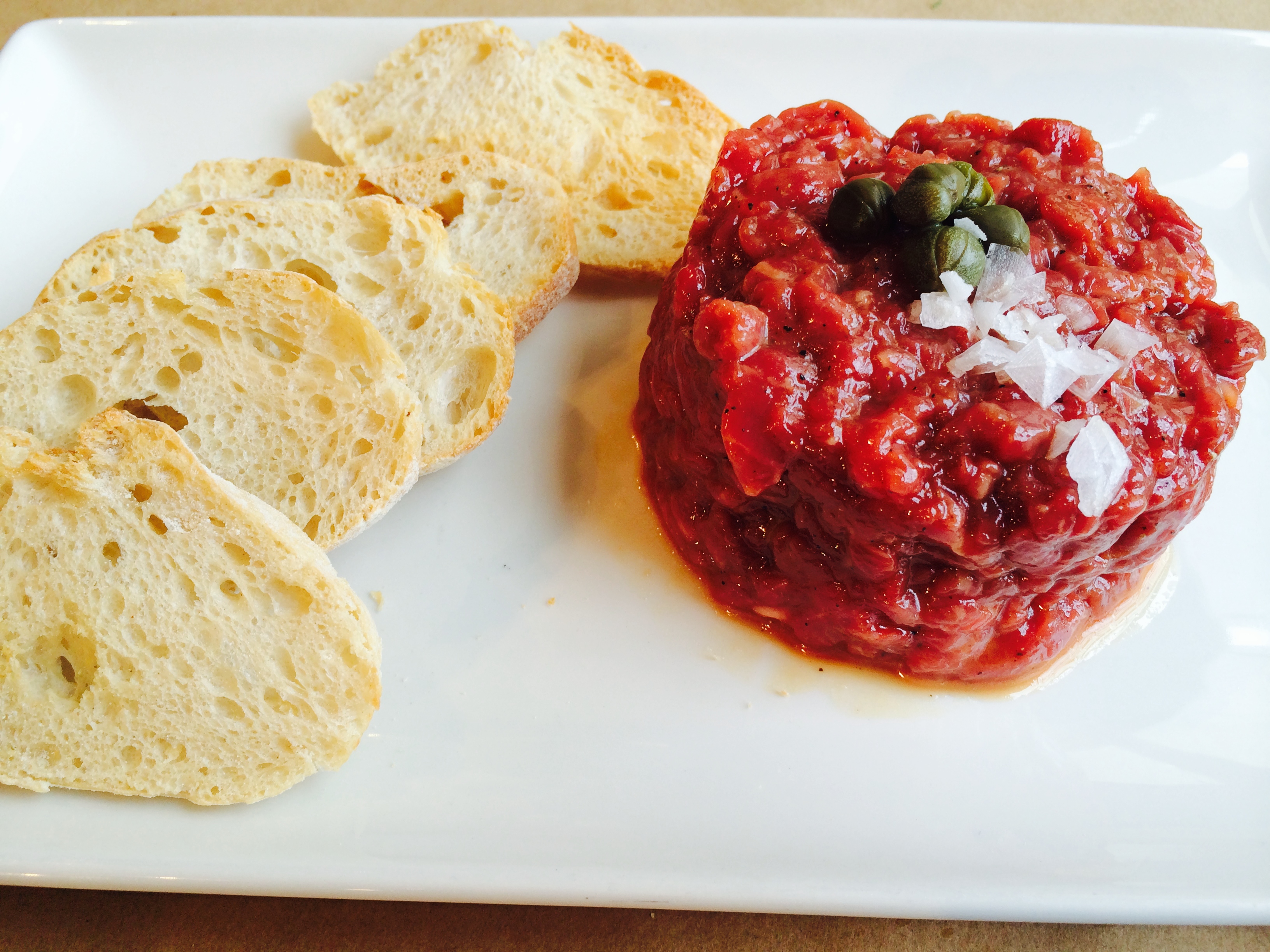 Yo, sin embargo, opté por el steak tartar, que para mi es un manjar si lo saben hacer bien…a este le faltaba un toque picante pero a su favor diré que estaba bien cortada la carne. La perfección en un steak tartar es laboriosa, ya que se trata de un plato al que no se le puede maquillar, hay que tratarlo con mucho cariño y usar una materia prima excelente.
