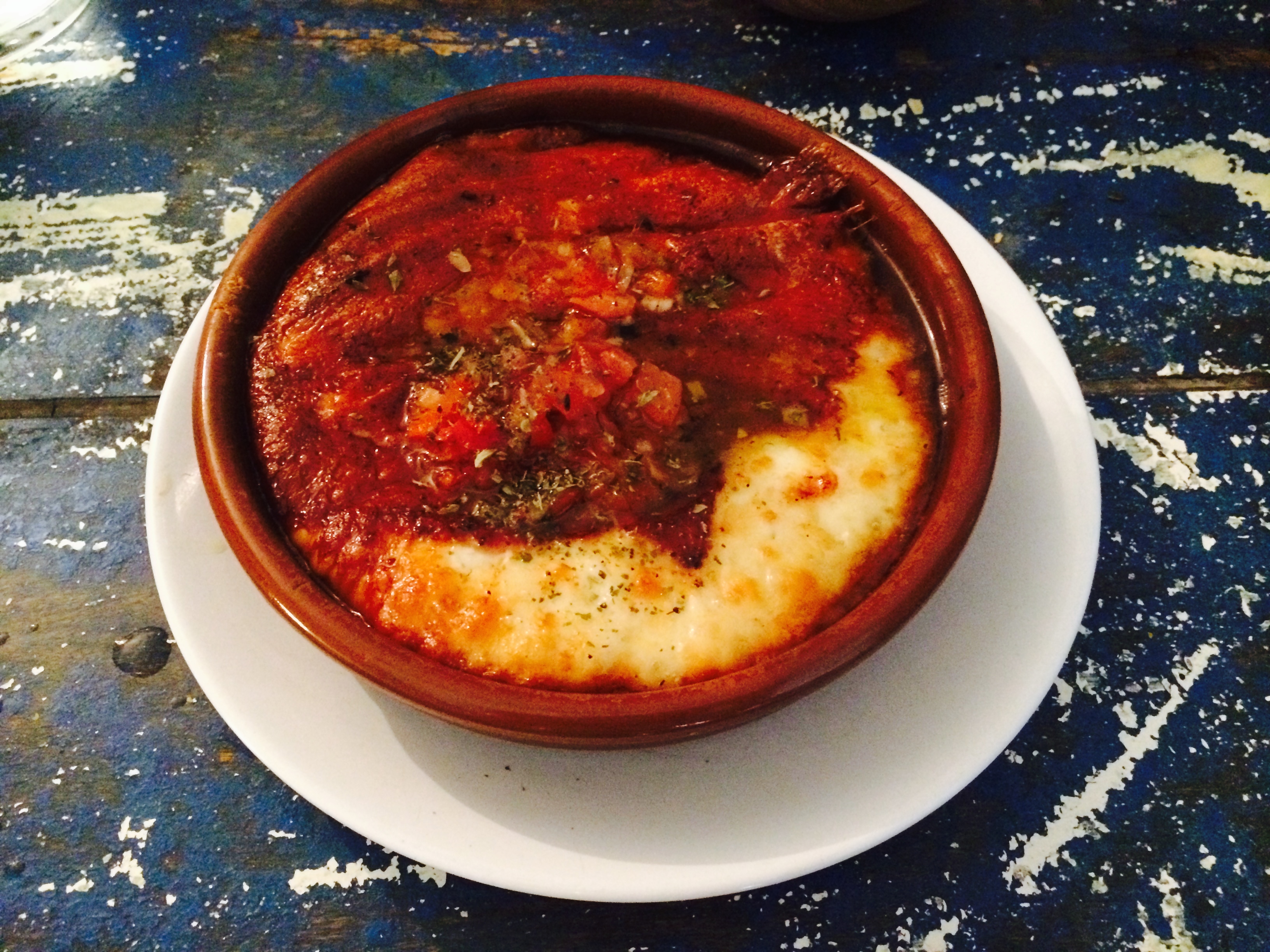 Los que nos leéis a menudo, os daréis cuenta que hay una serie de platos que no suelen fallar en nuestros posts, y entre ellos está el provolone. La diferencia, y lo más probable la razón por la que nos gustara tanto, es que estos chicos hacen el queso primero a la plancha y luego lo meten al horno, consiguiendo que se quede bastante tostado y lo rematan con una salsa criolla (pimiento, cebolla y tomate). Diría que el entrante que más me gustó de los tres.