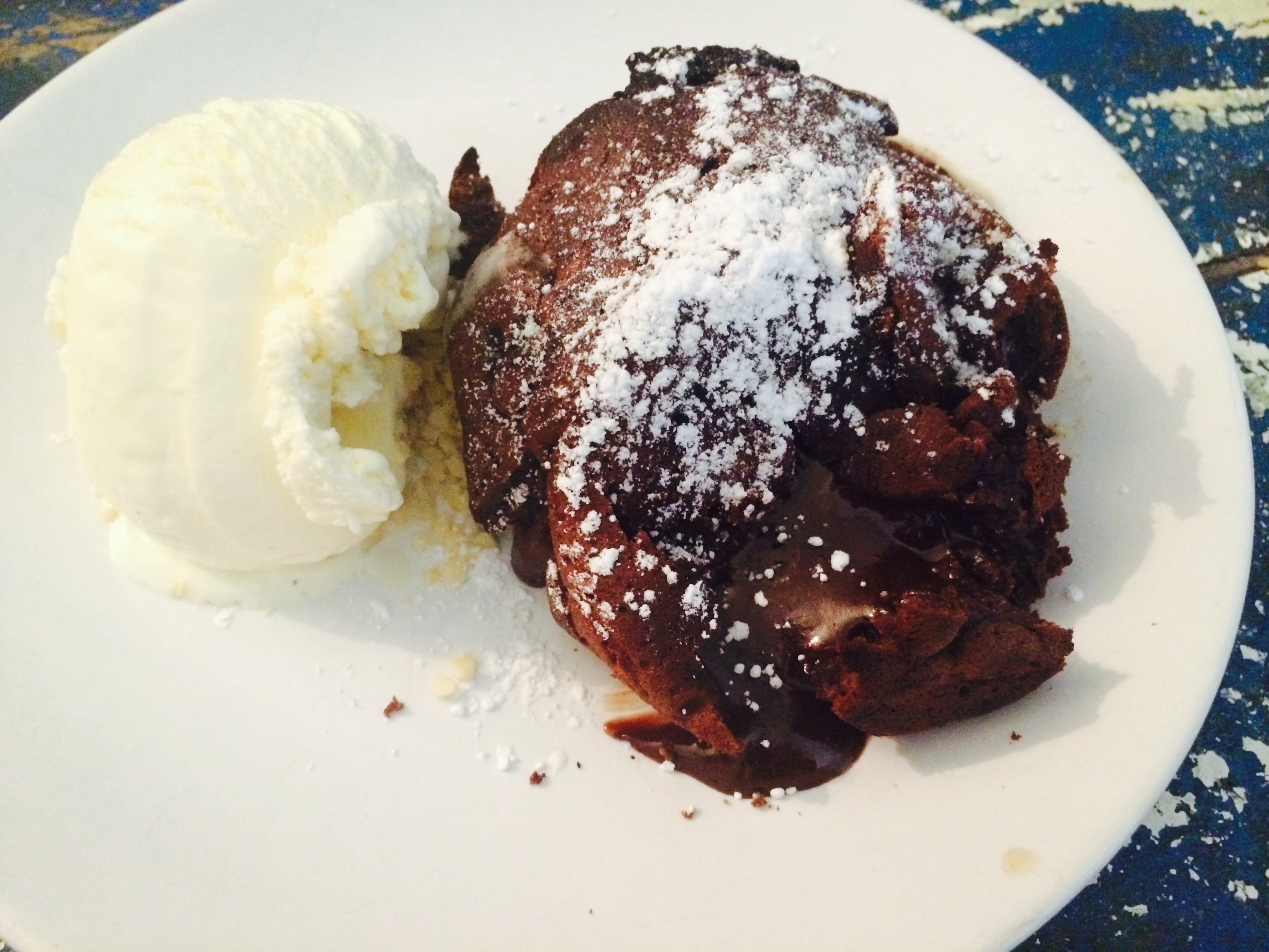 No podían faltar postres para esta larga y completa comida…empezamos con el volcán de chocolate con helado de nata, que nos avisaron que tarda 15 minutos en hacerse, cosa que nos gustó…porque es una señal con la que demuestran que no los calientan en el micro deprisa y corriendo. Y diré que de sabor estaba perfecto…una pena que se les desmontara al traerlo a la mesa.