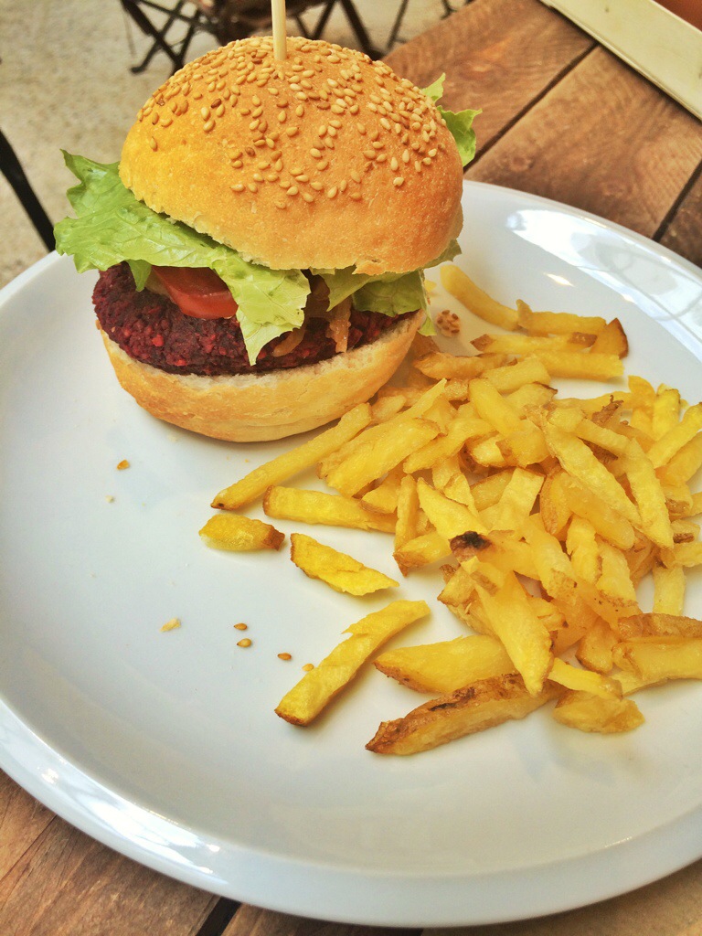 Como mi madre fue la encargada de eligir y le encanta la remolacha, probamos la hamburguesa de remolacha y mijo, un plato que no recomiendo a las personas que no sean muy fans este producto, porque tiene un intenso sabor, con lo que consigue todo el protagonismo del plato 🙂 . Pero es un alimento muy sano y nutritivo: potente anticancerígeno, rico en hierro, ácido fólico y fibra y buen aliado para todos aquellos que sufran retención de líquidos.
