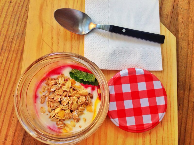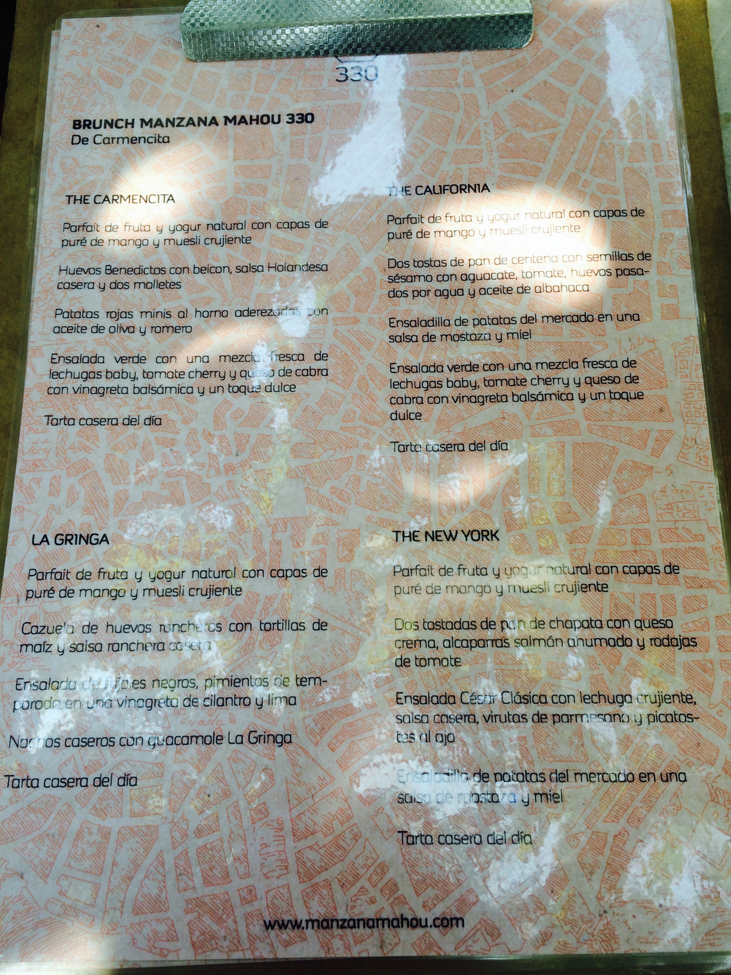 Ofrecen 4 tipos de brunch diferentes: The Carmencita, La Gringa, The California y The New York. Todos ellos tienen en común el primer plato: parfait de fruta y yogur natural con capas de puré de mango y muesli crujiente, que para mi gusto es la forma perfecta de empezar un brunch ;).