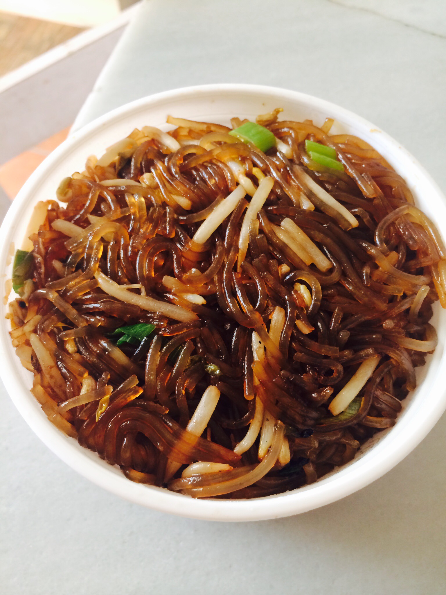 Nos apetecía probar los tallarines de fécula de batata salteados, porque nunca antes los habíamos visto y nos dejaron bastante indiferentes. El fideo estaba bueno, aunque le falta sabor al plato. Nosotros lo juntamos con las berenjenas y mejoraba, pero aún así fue el plato más flojo de la comida.